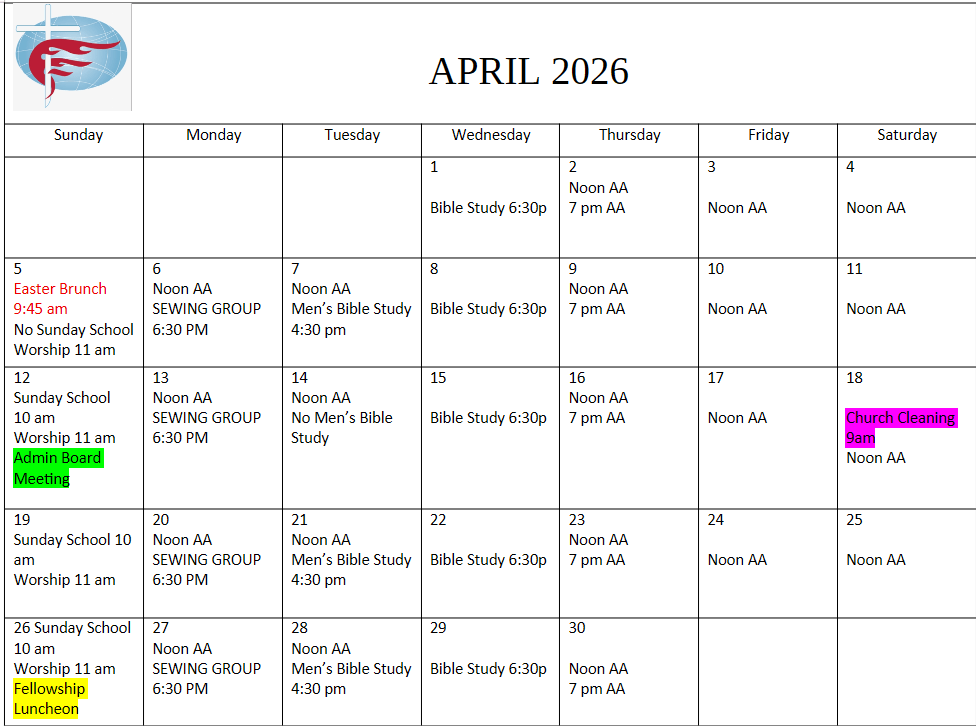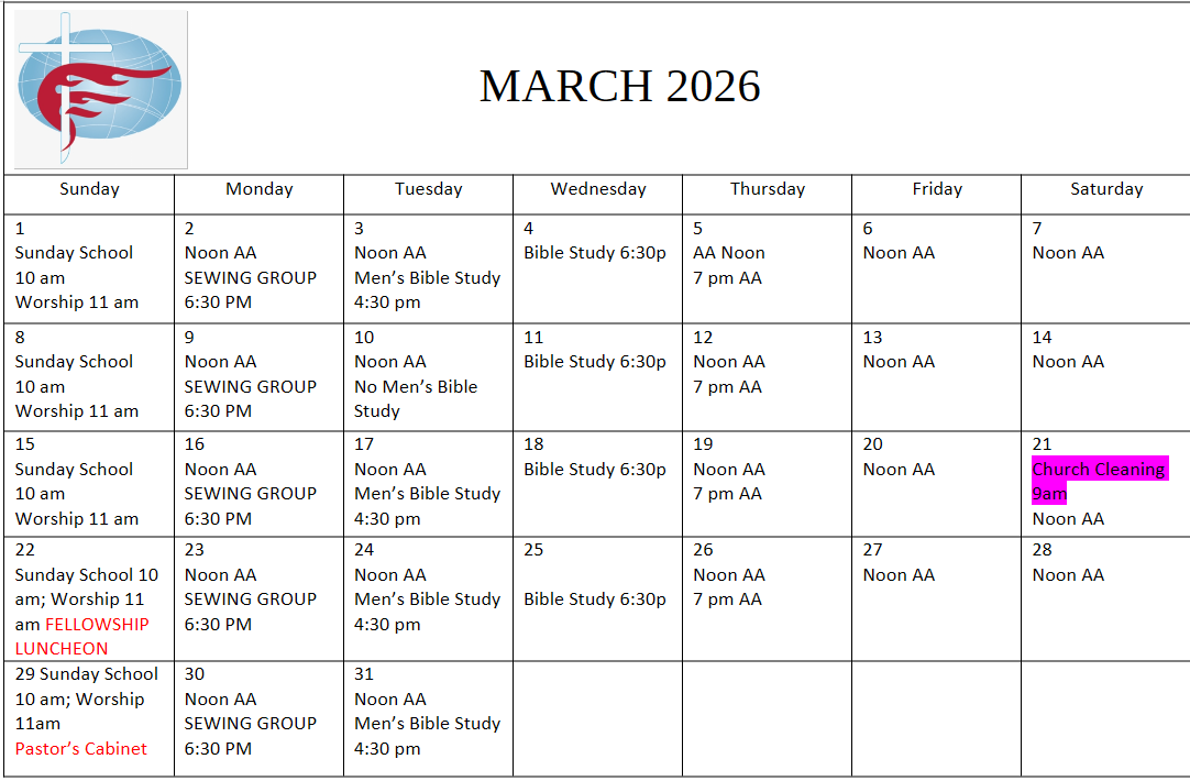 - Church Cleaning: monthly on a Saturday, 9:00 a.m.